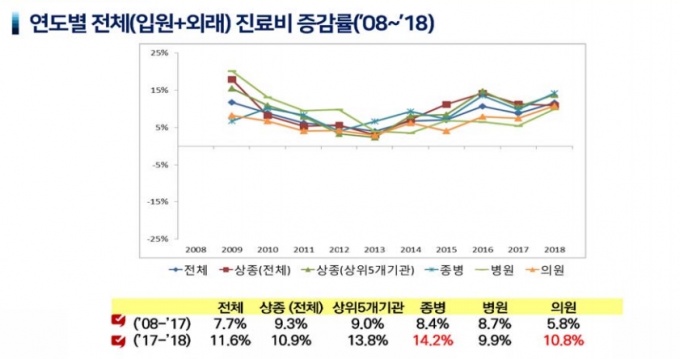 À̸¦ Á¾ÇÕÇØ Àüü(¿Ü·¡+ÀÔ¿ø) Áø·áºñ Áõ°¨·üÀ» µûÁ®º¸¸é, 2008~2017³â Àüü Áõ°¡À²Àº 7.7%·Î Áý°èµÆ°í »ó±ÞÁ¾ÇÕº´¿øÀº 9.3%·Î È®ÀεƴÙ. ºò5 º´¿øÀº 9%¿´´Ù.