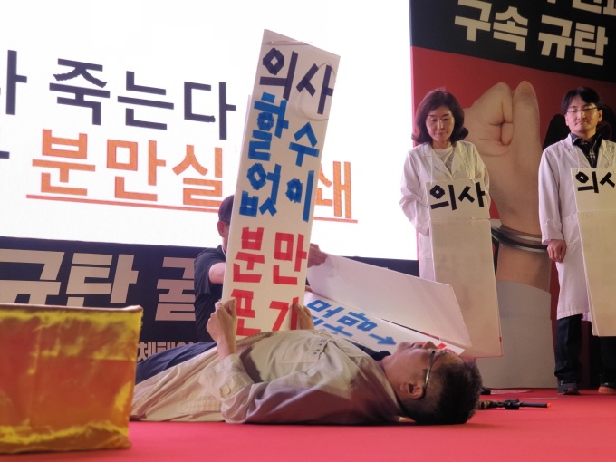 ÀÇ»ç ±¸¼Ó°ú °ü·ÃÇØ ¾à 600¿© ¸íÀÇ ÀÇ»çµéÀº ºñ°¡¿À´Â ±ÄÀº ³¯¾¾¿¡µµ ¼¿ï¿ª ±¤ÀåÀ» ä¿ü°í ¾ï¿ïÇÔÀ» È£¼ÒÇÏ´Â ¸ñ¼Ò¸®°¡ ³ÑÃijµ´Ù.