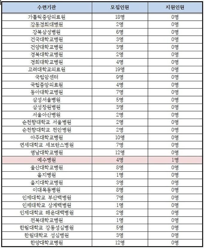 µ¥Àϸ®¸Þµð°¡ ¸¶°¨ÀÏÀÎ 24ÀÏ ¸ðÁý¿¡ ³ª¼± ¼ö·Ã±â°ü Áö¿øÇöȲÀ» Àü¼öÁ¶»çÇÑ °á°ú, ´ëºÎºÐÀÇ º´¿ø¿¡¼ Á¢¼öµÈ Áö¿ø¼´Â ¾ø¾ú´Ù. ¿Ü°ú 3³âÂ÷ ·¹Áö´øÆ® 1¸íÀ» È®º¸ÇÑ ¿¹¼öº´¿øÀÌ À̹ø ¸ðÁýÀÇ À¯ÀÏÇÑ °á½ÇÀ̾ú´Ù.