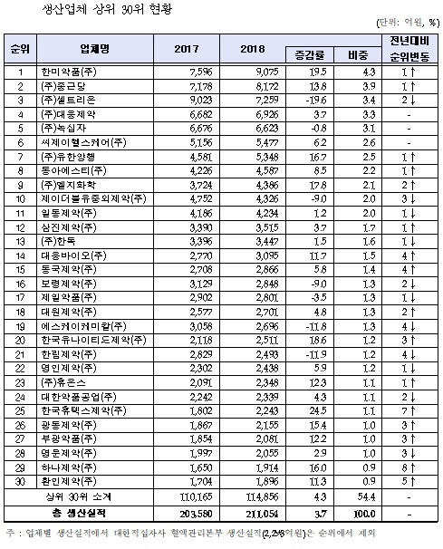 ƯÈ÷ Á¦¾à»çº° »ý»ê½ÇÀûÀ» »ìÆìº¸¸é Çѹ̾àǰÀº Áö³ÇØ Àü³â ´ëºñ 19.5% ¼ºÀåÇÑ 9075¾ï¿øÀ» ±â·ÏÇØ 1À§¸¦ Â÷ÁöÇß°í, µÚÀ̾î Á¾±Ù´ç(8172¾ï¿ø), ¼¿Æ®¸®¿Â(7259¾ï¿ø), ´ë¿õÁ¦¾à(6926¾ï¿ø) ¼øÀ̾ú´Ù.