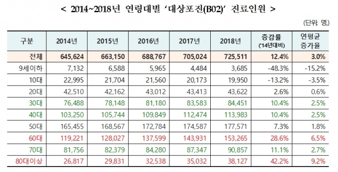 1ÀÏ ±¹¹Î°Ç°º¸Çè°ø´Ü(ÀÌ»çÀå ±è¿ëÀÍ)ÀÌ °Ç°º¸Çè Áø·áµ¥ÀÌÅ͸¦ Ȱ¿ëÇØ 2014~2018³â ‘´ë»óÆ÷Áø(B02)’¸¦ ºÐ¼®ÇÑ °á°ú, ȯÀÚ ¼ö´Â ¿¬Æò±Õ 3% Áõ°¡Çß´Ù. 2014³â 64¸¸¸í¿¡¼ 2018³â 72¸¸¸íÀ¸·Î 12.4% ´Ã¾î³ °ÍÀÌ´Ù.
