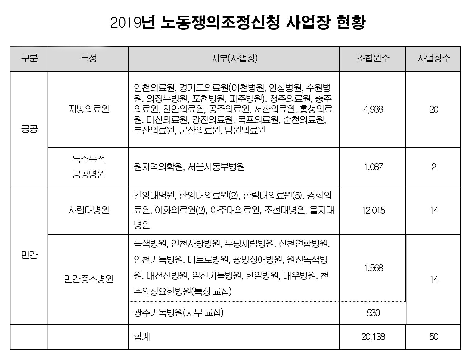 À̹ø¿¡ ³ëµ¿ÀïÀÇÁ¶Á¤½ÅûÀ» ÇÑ »ç¾÷ÀåÀº ¡ãƯ¼ö¸ñÀû°ø°øº´¿ø(2°³) ¡ãÁö¹æÀÇ·á¿ø(20°³) ¡ã¹Î°£Áß¼Òº´¿ø(14°³) ¡ã»ç¸³´ëº´¿ø(14°³) µî ¸ðµÎ 50°³ »ç¾÷ÀåÀÌ´Ù.
