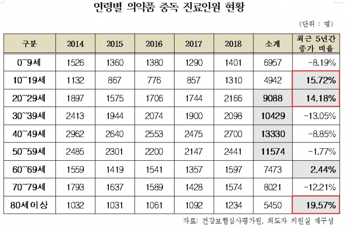 ±×·¯³ª ´õ Å« ¹®Á¦´Â û¼Ò³â°ú û³âÃþ ¾à¹°Áßµ¶ ȯÀÚ°¡ 4³â »õ °¢°¢ 15.72%, 14.19% Áõ°¡ÇØ 80¼¼ ÀÌ»óÀ» Á¦¿ÜÇÑ Àü(îï) ¿¬·ÉÃþ¿¡¼ °¡Àå ³ôÀº Áõ°¡¼¼¸¦ º¸¿´´Ù´Â Á¡ÀÌ´Ù.