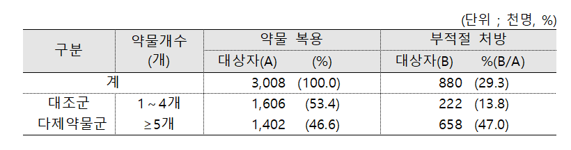 ´ë»óÀÚ Áß 5°³ ÀÌ»ó ´ÙÁ¦¾à¹°À» 󹿹ÞÀº »ç¶÷(ÀÌÇÏ ´ÙÁ¦¾à¹°±º)Àº 46.6%¿´À¸¸ç, ´ÙÁ¦¾à¹°±ºÀÌ 4°³ ÀÌÇÏ ¾à¹°À» 󹿹ÞÀº ±º(ÀÌÇÏ ´ëÁ¶±º)º¸´Ù ºÎÀûÀý 󹿷üµµ 33.2%p ´õ ³ô¾Ò´Ù.