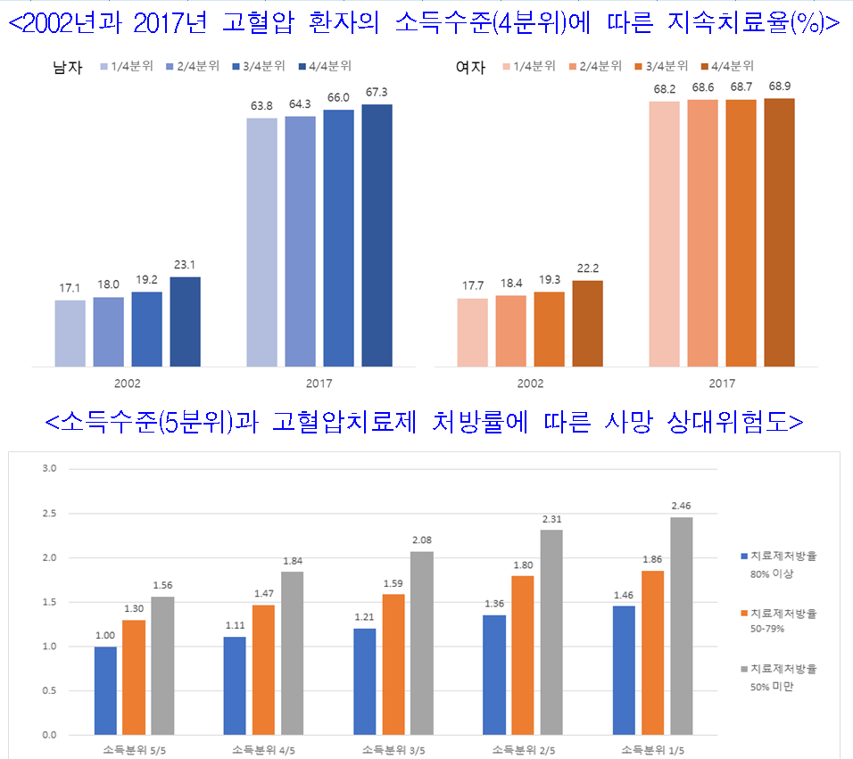 2002³âºÎÅÍ 2017³â »çÀÌ¿¡ °íÇ÷¾Ð ȯÀÚ Áß Áö¼ÓÀûÀ¸·Î Ä¡·áÇÏ´Â »ç¶÷ÀÇ ºñÀ²Àº Å©°Ô Çâ»óµÆÀ¸³ª ¼Òµæ¼öÁØ¿¡ µû¸¥ Â÷À̰¡ ³²¾Æ ÀÖÀ¸¸ç, ƯÈ÷ ÀþÀº ¿¬·ÉÃþ¿¡¼´Â °íÇ÷¾Ð Ä¡·áÀ²ÀÌ ¿©ÀüÈ÷ ³·¾Ò´Ù.