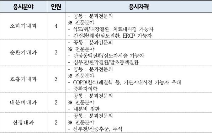 ¼¼ºÎ Áø·á°ú¸ñÀ¸·Î µé¾î°¡¸é ÀÚ°ÝÀº ´õ¿í ±î´Ù·Î¿öÁø´Ù. ÃÑ 18¸íÀ» ¸ðÁýÇÏ´Â ³»°úÀÇ °æ¿ì ºÐ°úÀü¹®ÀÇ ÀÚ°ÝÀÌ ÀÖ¾î¾ß ÇÑ´Ù.
