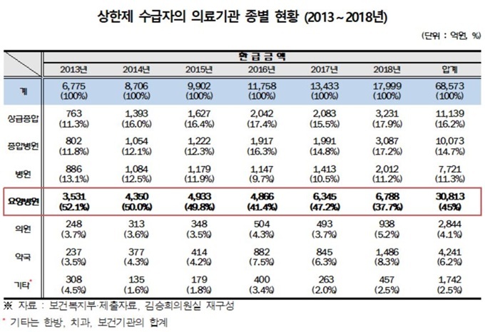 ÀÌ´Â º»Àκδã»óÇÑÁ¦ ¼ö±ÞÀÚ È¯±Þ±Ý¾× 6Á¶ 8573¾ï¿øÀÇ 45% ±Ô¸ðÀε¥, ¿ä¾çº´¿ø º»Àκδã±Ý ȯ±Þ¾×Àº Á¡ÁøÀûÀ¸·Î Áõ°¡ÇÏ´Â Ãß¼¼´Ù. 2013³â 3531¾ï¿ø, 2014³â 4350¾ï¿ø, 2015³â 4933¾ï¿ø, 2016³â 4866¾ï¿ø, 2017³â 6345¾ï¿ø, Áö³ÇØ 6788¾ï¿ø µîÀÌ´Ù.