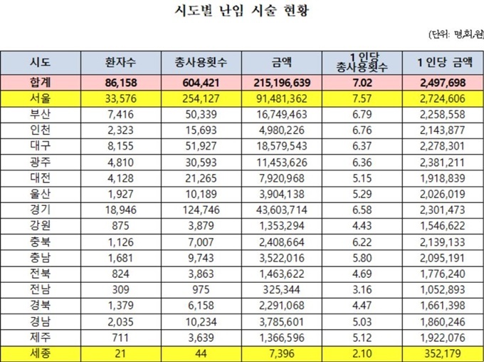 1ÀÎ´ç ³ÀÓ ½Ã¼ú Ƚ¼ö°¡ °¡Àå ¸¹Àº Áö¿ªÀº ¼¿ï(7.57ȸ), ºÎ»ê(6.79ȸ), ÀÎõ(6.76ȸ), °¿ø(4.43ȸ), Àü³²(3.16ȸ), ¼¼Á¾(2.10ȸ) µîÀ̾ú´Ù.