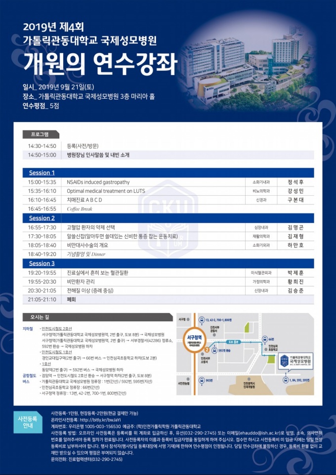ÇÑÆí, À̹ø ¿¬¼ö°Á´ »çÀüµî·ÏÀÌ °¡´ÉÇϸç Âü°¡ÀÚ¿¡°Ô´Â ´ëÇÑÀÇ»çÇùȸ ÆòÁ¡ 5Á¡ÀÌ ÁÖ¾îÁø´Ù. ÀÚ¼¼ÇÑ ¹®ÀÇ´Â ±¹Á¦¼º¸ðº´¿ø Áø·áÇù·Â¼¾ÅÍ·Î ÇÏ¸é µÈ´Ù. |