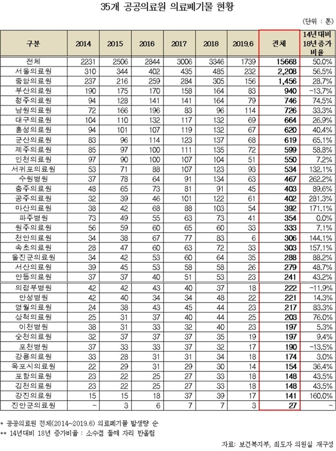 ¶Ç 2014³âºÎÅÍ Áö³ÇرîÁö ÀÇ·á±â°üº° ÀÇ·áÆó±â¹° Áõ°¡À²Àº Ãæ³² °øÁÖÀÇ·á¿ø(32Åæ→122Åæ, 281.3%), °æ±â ¼ö¿øº´¿ø(262.2%), °æ³² ¸¶»êÀÇ·á¿ø(171.1%), Àü³² °ÁøÀÇ·á¿ø(160%), °¿ø ¼ÓÃÊÀÇ·á¿ø(157.1%) ¼øÀ̾ú´Ù.