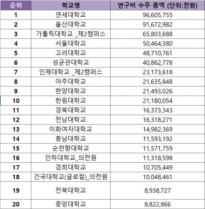 20ÀÏ ±³À°ºÎ ´ëÇо˸®¹Ì¿¡ °ø½ÃµÈ Àü±¹ Àǰú´ëÇÐ ¹× ÀÇÀü¿ø 40°÷ÀÇ 2018³â ±³³»¿Ü ¿¬±¸ºñ ¼öÇý ³»¿ªÀ» ºÐ¼®ÇÑ °á°ú, °¡Àå ¸¹Àº ¿¬±¸ºñ¸¦ ¹ÞÀº Àǰú´ëÇÐÀº ¿¬¼¼´ëÇб³(966¾ï¿ø)·Î ³ªÅ¸³µ´Ù.