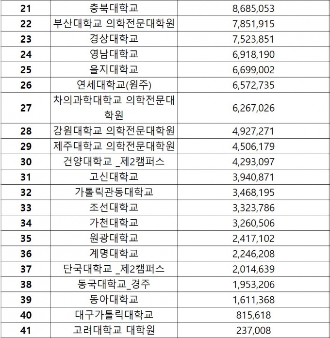 ÇÏÀ§ 10°³ ´ëÇÐÀº ¡ã°í½Å´ëÇб³(39¾ï¿ø) ¡ã°¡Å縯°üµ¿´ëÇб³(34¾ï¿ø) ¡ãÁ¶¼±´ëÇб³(33¾ï¿ø) ¡ã°¡Ãµ´ëÇб³(32¾ï¿ø) ¡ã¿ø±¤´ëÇб³(24¾ï¿ø) ¡ã°è¸í´ëÇб³(22¾ï¿ø) ¡ã´Ü±¹´ë 2Ä·ÆÛ½º(20.2¾ï¿ø) ¡ãµ¿±¹´ë °æÁÖ(20.1¾ï¿ø) ¡ãµ¿¾Æ´ëÇб³(16¾ï¿ø) ¡ã´ë±¸°¡Å縯´ëÇб³(8¾ï¿ø)¿Í °í·Á´ëÇб³ ÀÇÀü¿ø(2¾ï¿ø) ¼øÀ¸·Î ³ªÅ¸³µ´Ù.