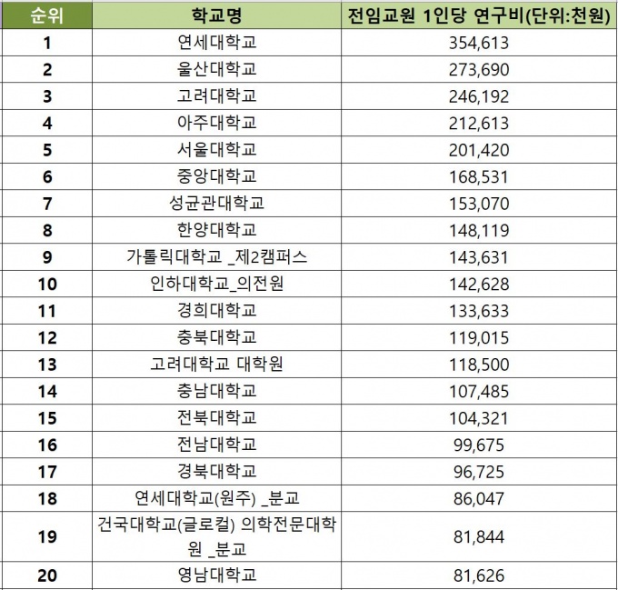 ÀüÀÓ±³¿ø 1ÀÎ´ç °¡Àå ¸¹Àº ¿¬±¸ºñ¸¦ ¼öÁÖÇÑ ´ëÇÐ ¿ª½Ã ¿¬¼¼´ëÇб³(3¾ï5000¸¸¿ø)·Î ³ªÅ¸³µ´Ù. ÀÌ¾î ¡ã¿ï»ê´ëÇб³(2¾ï7000¸¸¿ø) ¡ã°í·Á´ëÇб³(2¾ï4000¸¸¿ø) ¡ã¾ÆÁÖ´ëÇб³(2¾ï1000¸¸¿ø) ¡ã¼¿ï´ëÇб³(2¾ï¿ø) ¼øÀ̾ú´Ù.