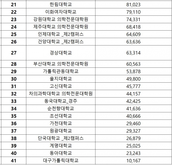°í½Å´ëÇб³°¡ 4¾ï5000¸¸¿øÀ¸·Î 30À§¸¦ ±â·ÏÇßÀ¸¸ç, ÀÌ¾î ¡ãÂ÷Àǰú´ëÇб³ ÀÇÀü¿ø(4¾ï4000¸¸¿ø) ¡ãµ¿±¹´ëÇб³ °æÁÖÄ·ÆÛ½º(4¾ï2000¸¸¿ø) ¡ã¼øÃµÇâ´ëÇб³(4¾ï1000¸¸¿ø) ¡ãÁ¶¼±´ëÇб³(4¾ï¿ø) ¡ã°¡Ãµ´ëÇб³(2¾ï9400¸¸¿ø) ¼øÀ¸·Î ³ªÅ¸³µ´Ù.