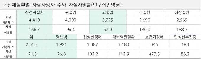 ´ÙÀ½À¸·Î´Â ¼º°ÝÀå¾Ö(ÀÚ»ì·ü 879.8¸í, ÀÚ»ì»ç¸ÁÀÚ ¼ö 133¸í), ¾ËÄÚ¿Ã »ç¿ëÀå¾Ö(ÀÚ»ì·ü 677.8¸í, ÀÚ»ì»ç¸ÁÀÚ ¼ö 603¸í), ÇàÅÂÁõÈıº(ÀÚ»ì·ü 658.7¸í, ÀÚ»ì»ç¸ÁÀÚ ¼ö 114¸í), ¾ç±Ø¼ºÀå¾Ö(ÀÚ»ì·ü 581.6¸í, ÀÚ»ì»ç¸ÁÀÚ ¼ö 582¸í) ¼øÀ¸·Î ÀÚ»ì·üÀÌ ³ô¾Ò´Ù.