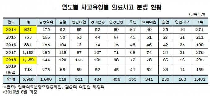 ±¹È¸ º¸°Çº¹ÁöÀ§¿øÈ¸ ¼Ò¼Ó ±è½ÂÈñ ÀÚÀ¯Çѱ¹´ç ÀÇ¿ø½ÇÀÌ Çѱ¹ÀÇ·áºÐÀïÁ¶Á¤ÁßÀç¿øÀ¸·ÎºÎÅÍ ¹ÞÀº ÀÚ·á¿¡ µû¸£¸é 2014³â 827°ÇÀ̾ú´ø ÀÇ·á»ç°í ºÐÀïÀº 2018³â 1589°ÇÀ¸·Î 4³â »õ ¾à 2¹è Áõ°¡Çß´Ù.