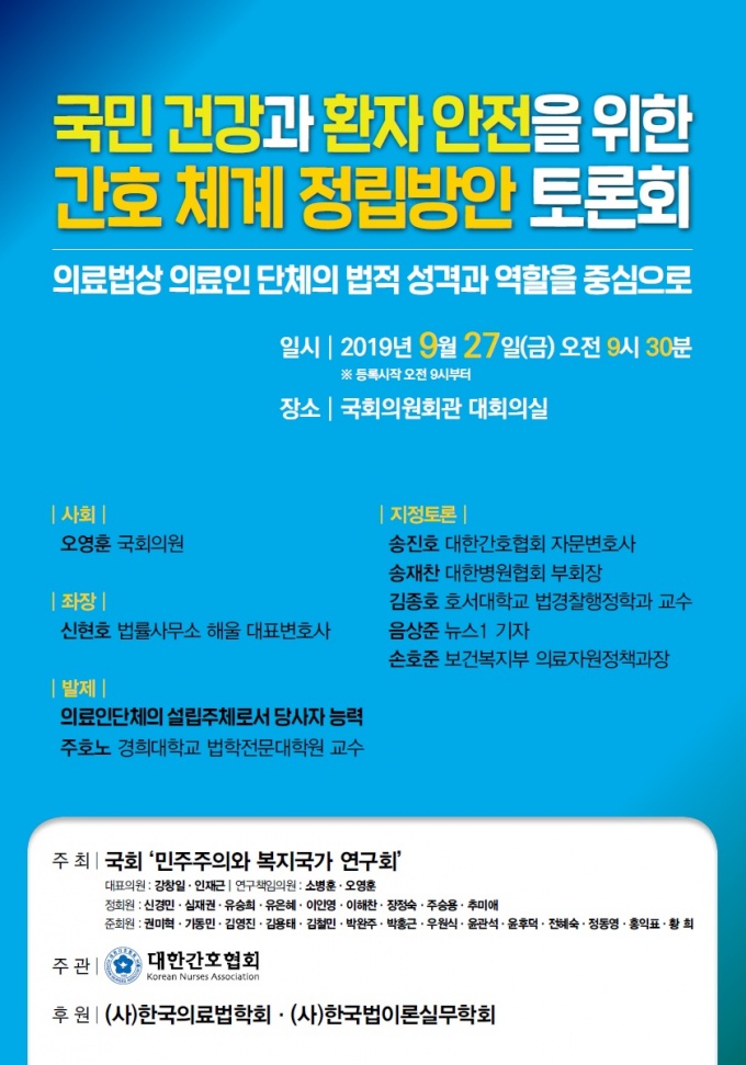 [µ¥Àϸ®¸Þµð ¹Ú¼ºÀº ±âÀÚ] ´ëÇѰ£È£Çùȸ(ȸÀå ½Å°æ¸²)´Â 9¿ù 27ÀÏ ¿ÀÀü 9½Ã30ºÐ ±¹È¸ÀÇ¿øÈ¸°ü ´ëȸÀǽǿ¡¼ ‘±¹¹Î °Ç°°ú ȯÀÚ ¾ÈÀüÀ» À§ÇÑ °£È£Ã¼°è Á¤¸³¹æ¾È Åä·Ðȸ – ÀÇ·á¹ý»ó ÀÇ·áÀÎ ´ÜüÀÇ ¹ýÀû ¼º°Ý°ú ¿ªÇÒÀ» Áß½ÉÀ¸·Î'¸¦ °³ÃÖÇÑ´Ù.