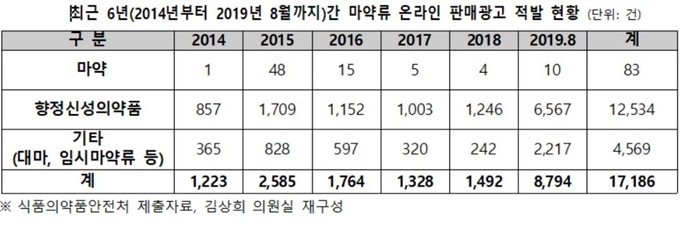 29ÀÏ ±¹È¸ º¸°Çº¹ÁöÀ§¿øÈ¸ ±è»óÈñ ÀÇ¿ø(´õºÒ¾î¹ÎÁÖ´ç)ÀÌ ½ÄǰÀǾàǰ¾ÈÀüó(½Ä¾àó)·ÎºÎÅÍ Á¦Ãâ ¹ÞÀº ÀÚ·á¿¡ µû¸£¸é ¸¶¾à·ù ¿Â¶óÀÎ ÆÇ¸Å ±¤°í Àû¹ß °Ç¼ö´Â 2014³âºÎÅÍ ¿ÃÇØ 8¿ù±îÁö 5³â »õ ÃÑ 1¸¸ 7186°Ç¿¡ ´ÞÇß´Ù.