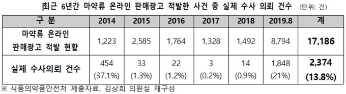 ÇÏÁö¸¸ ¿Â¶óÀÎ ¸¶¾à·ù ºÒ¹ýÆÇ¸Å±¤°í Àû¹ßÀÌ ¼ö»çÀÇ·Ú·Î À̾îÁø °Ç¼ö´Â 2374°ÇÀ¸·Î, ÃÑ Àû¹ß °Ç¼öÀÇ 13.8%¿¡ ±×ÃÆ´Ù. ´Ü¼ÓÀ» ÇØµµ ¼ö»ç·Î À̾îÁöÁö´Â ¾Ê¾Ò´Ù´Â °ÍÀÌ´Ù.