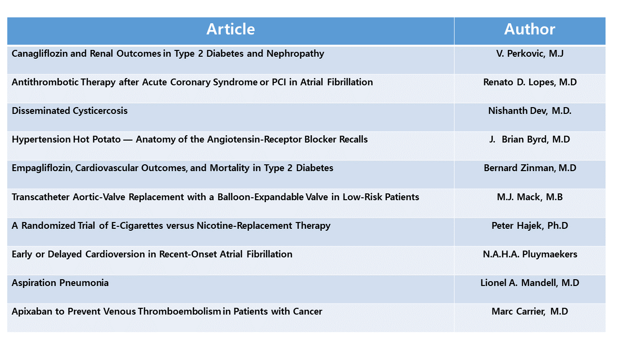 [µ¥Àϸ®¸Þµð ¹ÚÁ¤¿¬ ±âÀÚ] ¼¼°è ÃÖ°í ±ÇÀ§ ÀÇÇÐÀú³ÎÀÎ ´ºÀ×±Û·£Àú³Î¿Àºê¸Þµð½¼(NEJM, New England journal of medicine)Àº µ¿½Ã±â ÀÇÇÐ°è ¿¬±¸ Áß¿¡¼µµ ¼Õ ²ÅÈ÷´Â ¿¬±¸ °á°úµé¸¸ ¼Ò°³µÈ´Ù. NEJMÀº ±¹Á¦ ÀÇÇÐ°è µ¿Çâ ¹× È帧À» »ìÇÊ ¼ö ÀÖ´Â ÁöÇ¥À̱⵵ ÇÏ´Ù. NEJMÀº ÃÖ±Ù 2019³â »ó¹Ý±â(1¿ù~7¿ù) °¡Àå ¸¹ÀÌ ÀÐÈù ¾ÆÆ¼Å¬ »óÀ§ 10°³¸¦ °ø°³Çß´Ù. ´Ù¾çÇÑ ºÐ¾ßÀÇ ¿¬±¸ °á°ú¹°ÀÌ °ñ°í·ç °ü½ÉÀ» ¹ÞÀº °¡¿îµ¥¼µµ ÃÖ±Ù »çȸÀûÀ¸·Î À̽´°¡ µÈ »ç¾ÈÀÌ Æ¯È÷ ³ôÀº °ü½ÉÀ» ¹Þ¾Ò´Ù. ½ÉÀå ¿¬°ü ³í¹®ÀÌ 5°³·Î °¡Àå ¸¹¾Ò°í Á¦2Çü ´ç´¢º´ °ü·Ã ÁÖ¿ä Ä¡·áÁ¦ÀÎ SGLT-2¿¡ ´ëÇÑ ¾ÆÆ¼Å¬ÀÌ »óÀ§ 10°³ Áß 2°³¿¡ À̸§À» ¿Ã·È´Ù. ¶Ç ÀüÀÚ´ã¹è¿¡ ´ëÇÑ »çȸÀû °ü½É°ú ¼ÒºñÇö»óÀ» ¹Ý¿µÇÏµí °ü·Ã ¾ÆÆ¼Å¬µµ ÁÖ¸ñÀ» ¹Þ¾Ò´Ù. ÀǾà°è¿¡¼ Å« ³í¶õÀ» ÀÏÀ¸Å² °íÇ÷¾Ð ¼ººÐ ¹ß»ç¸£ÅºÀÇ ¹ß¾Ï¹°Áú °ü·Ã ¿¬±¸¿¡µµ À̸ñÀÌ ÁýÁߵƴÙ. Áø·á°ú¸ñº°·Î »ìÆìº¸¸é ¼øÈ¯±â³»°ú(5°Ç) °ü·Ã ¿¬±¸ °á°ú°¡ °¡Àå ¸¹ÀÌ ÀÐÇû´Ù. ÀÌ¾î ³»ºÐºñ³»°ú(2°Ç), ¼Òȱ⳻°ú(1°Ç), È£Èí±â³»°ú(2°Ç), °¨¿°³»°ú(1°Ç) ¼øÀ¸·Î ³ªÅ¸³µ´Ù. ÀÇÇÐ°è ¿¬±¸ÀÇ ÁÖ·ù¸¦ Çü¼ºÇϰí ÀÖ´Â ¹Ì±¹ÀÌ ½ÉÀåÁúȯ¿¡ ´ëÇØ ³ôÀº °ü½ÉÀ» °®°í Àֱ⠶§¹®À¸·Î Ç®À̵ȴÙ. ±¹°¡º°·Î »ìÆìº¸¸é ¹Ì±¹ ¿¬±¸ÆÀ(4ÆÀ)ÀÌ ´Ù¼ö Æ÷ÁøÇß´Ù. À̾î ij³ª´Ù(2ÆÀ), È£ÁÖ(1ÆÀ), ³×´ú¶õµå(1ÆÀ), ¿µ±¹(1ÆÀ), Àεµ(1ÆÀ)ÀÇ ¿¬±¸ÁøµéÀÌ °ü½Éµµ ³ôÀº °á°ú¹°À» ³»³ù´Ù. ±âÃÊ¿¬±¸º¸´Ù´Â Àӻ󿬱¸¿¡ ÁßÁ¡À» µÎ´Â NEJM Ư¼º Å¿ÀÎÁö ¾Æ½±°Ôµµ Çѱ¹ ÀÇ·áÁøµéÀÌ ³»³õÀº ¿¬±¸ °á°ú´Â °¡Àå ¸¹ÀÌ ÀÐÈù ¾ÆÆ¼Å¬ ¸í´Ü¿¡ À̸§À» ¿Ã¸®Áö ¸øÇß´Ù. ±¹Á¦ ÀÇ·á°è È帧À» ¿³º¼ ¼ö ÀÖ´Â '»ó¹Ý±â NEJM¿¡¼ °¡Àå ¸¹Àº Á¶È¸¼ö¸¦ ±â·ÏÇÑ 10°³ ¾ÆÆ¼Å¬À» ºÐ¼®ÇغôÙ. ³ª¿µÈ ¾ÆÆ¼Å¬Àº °¡Àå ¸¹ÀÌ ÀÐÈù ¼øÀ§¿Í´Â ¹«°üÇÏ´Ù.
