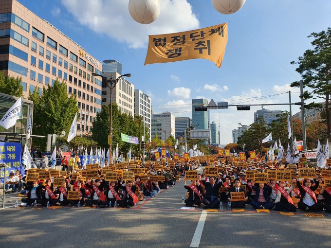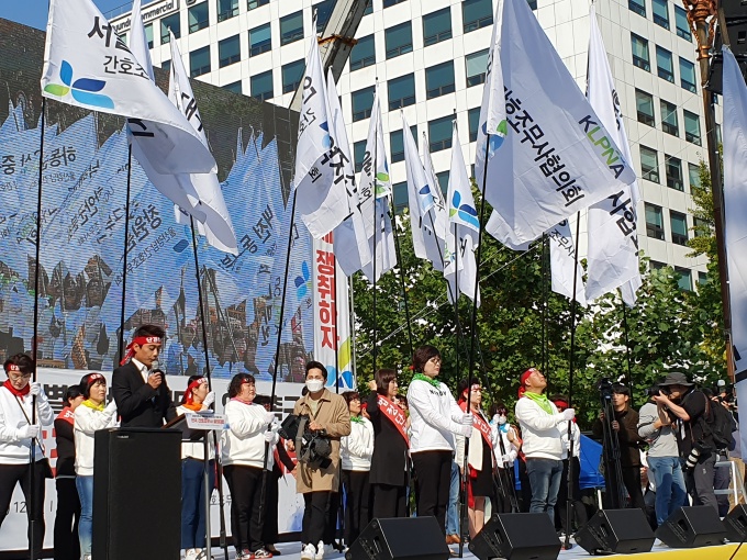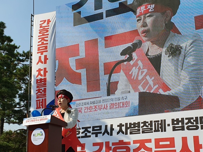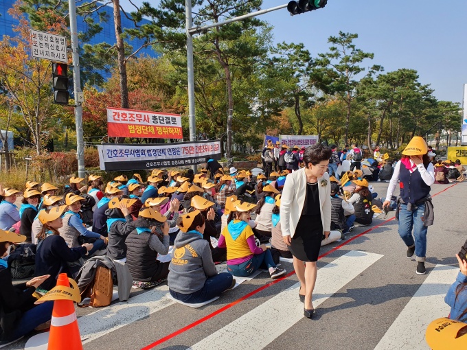 ´ëÇѰ£È£Á¶¹«»çÇùȸ°¡ 11¿ù 3ÀÏ ¼¿ï ¿©Àǵµ ±¹È¸ ¾Õ¿¡¼ ‘Àü±¹ °£È£Á¶¹«»ç °áÀÇ´ëȸ’¸¦ °³ÃÖÇÏ°í °£È£Á¶¹«»ç¿¡ ´ëÇÑ Â÷º°Ã¶Æó¿Í ¹ýÁ¤´Üü ÀÎÁ¤À» Ã˱¸Çß´Ù. Áö³ 7¿ù °£¹«ÇùÀÇ ¹ýÁ¤´Üüȸ¦ ³»¿ëÀ¸·Î ÇÏ´Â ÀÇ·á¹ý °³Á¤¾ÈÀÌ ÃÖµµÀÚ ¹Ù¸¥¹Ì·¡´ç ÀÇ¿ø¿¡ ÀÇÇØ ¹ßÀǵÆÁö¸¸ Åë°úµÇÁö ¸øÇÑ ÀÌÈÄ °£¹«ÇùÀº ±¹È¸ ¾Õ¿¡¼ 1ÀÎ ½ÃÀ§ µîÀ» ÅëÇØ Áö¼ÓÀûÀ¸·Î ¹ý¾È Åë°ú¸¦ ¿ä±¸ÇؿԴÙ. ´ëÇѰ£È£Çùȸ´Â °£È£Á¶¹«»ç ¹ýÁ¤´Üüȿ¡ Áö¼ÓÀûÀ¸·Î ¹Ý´ëÀÔÀåÀ» Ç¥¸íÇϰí ÀÖ¾î µÎ ´Üü °£ °¥µîÀÌ À̾îÁö°í ÀÖ´Ù. 3ÀÏ Çà»ç ¸ð½ÀÀ» »çÁø¿¡ ´ã¾ÆºÃ´Ù. [ÆíÁýÀÚÁÖ]