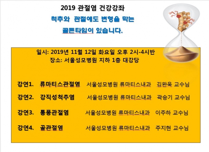 °üÀý¿°¿¡ °ü½ÉÀÌ ÀÖ´Â ÀϹÝÀΰú ȯ¿ì¸¦ ´ë»óÀ¸·Î ¹«·á·Î ÁøÇàµÇ¸ç, ·ù¸¶Æ¼½º °üÀý¿° · °Á÷¼ºÃ´Ãß¿° · Åëdz°üÀý¿° · °ñ°üÀý¿°ÀÇ Áõ»ó°ú Áø´Ü, ÃֽŠġ·á¹ý ¼Ò°³ µî ´Ù¾çÇÑ °üÀý¿°¿¡ ´ëÇÑ ÃÖ½ÅÁö°ßÀ» ¾Ë±â ½±°Ô ¼Ò°³ÇÑ´Ù.