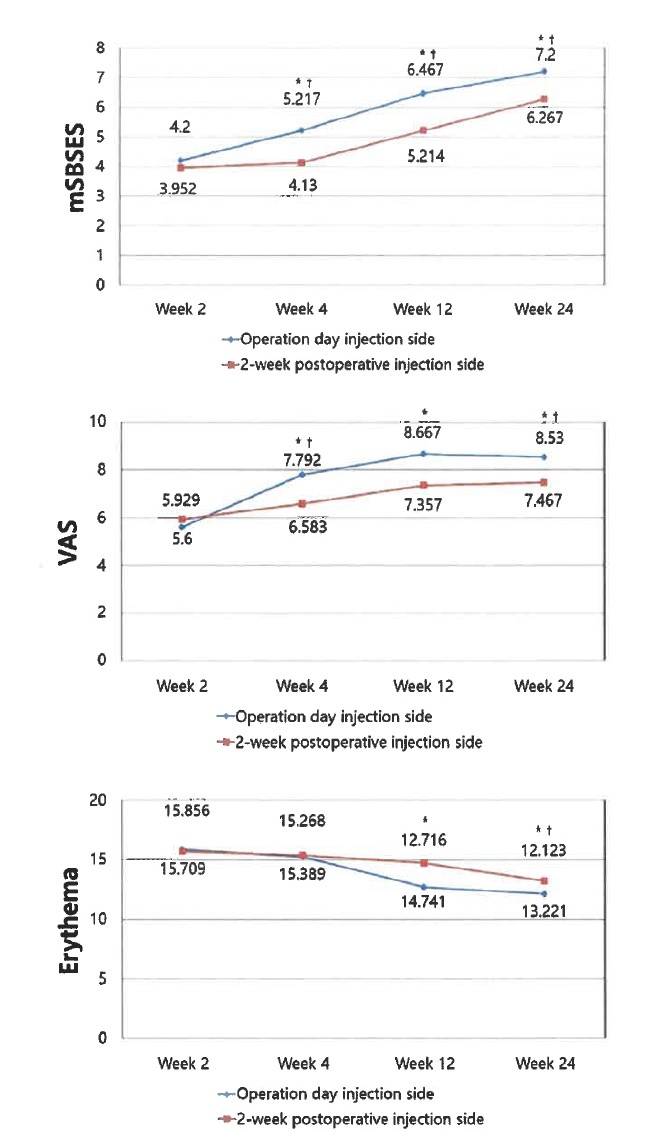 ±× °á°ú, °¢ ÃøÁ¤ ½ÃÁ¡¿¡¼ ¼ö¼ú ´çÀÏ ³ªº¸Å¸¸¦ Åõ¿©ÇÑ ºÎÀ§ÀÇ ÈäÅÍ Æò°¡ ôµµ(mSBSES) Æò±Õ°ªÀÌ ¼ö¼ú 2ÁÖ ÈÄ ³ªº¸Å¸¸¦ Åõ¿©ÇÑ ºÎÀ§ÀÇ ÃøÁ¤°ªº¸´Ù ³ô°Ô ³ªÅ¸³µÀ¸¸ç, ¼ö¼ú ÈÄ 4ÁÖ Â÷ºÎÅÍ Åë°èÀûÀ¸·Î À¯ÀǹÌÇÑ Â÷À̸¦ º¸¿´´Ù.