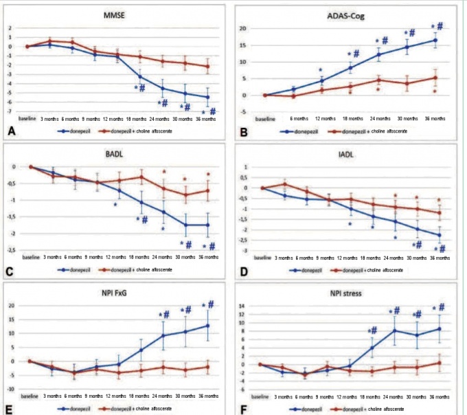 ASCOMALVA ¿¬±¸¿¡¼ ÇÇÇèÀÚµéÀº µµ³×ÆäÁú ´Üµ¶±º°ú Äݸ°¾ËÆ÷¼¼·¹ÀÌÆ® º´¿ë±ºÀ» ¹«ÀÛÀ§ ¹èÁ¤µÆ°í, 24°³¿ù ÈÄ mini-mental state examination (MMSE), Alzheimer’s Disease Assessment Scale (ADAS-cog), Basic activities of daily living(BADL), Instrumental activities of daily living (IADL), Neuropsychiatric Inventory frequency severity (NPI-F) ¹× Neuropsychiatric Inventory, distress for the caregiver(NPI-D)¸¦ Àû¿ëÇß´Ù.