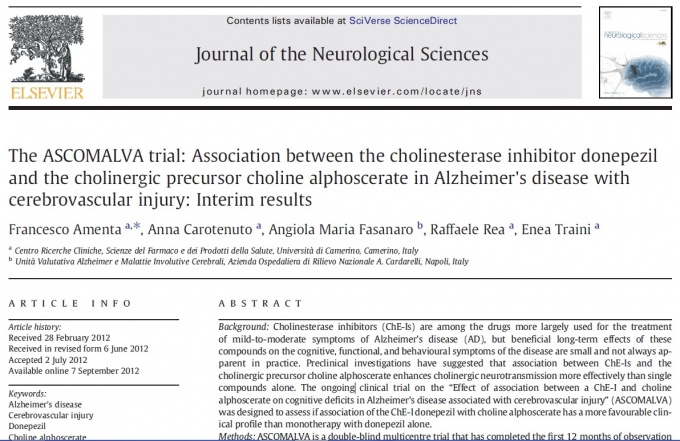 Äݸ°¾ËÆ÷¼¼·¹ÀÌÆ®ÀÇ È¿°ú¸¦ µÞ¹ÞħÇÏ´Â ÀÚ·á Áß ´ëÇ¥ÀûÀÎ Àӻ󿬱¸´Â 'ASCOMALVA(Association between the Cholinesterase Inhibitor Donepezil and the Cholinergic Precursor Choline Alfoscerate in AD)'´Ù.