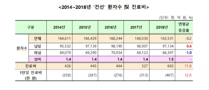 ±¹¹Î°Ç°º¸Çè°ø´Ü(ÀÌ»çÀå ±è¿ëÀÍ)ÀÌ °Ç°º¸Çè Áø·áµ¥ÀÌÅ͸¦ Ȱ¿ëÇØ 2014~2018³â°£ ‘°Ç¼±(Áúº´ÄÚµå:L40)’ Áø·á ȯÀÚ¸¦ ºÐ¼®ÇÑ Áúº´Åë°è ÀÚ·á¿¡ µû¸£¸é °Ç¼± Áø·áºñ´Â 5³â°£ ¿¬Æò±Õ 11.8% »ó½ÂÇØ 426¾ï¿ø(2014³â)¿¡¼ 665¾ï¿ø(2018³â)À¸·Î 239¾ï¿øÀÌ Áõ°¡Çß´Ù.