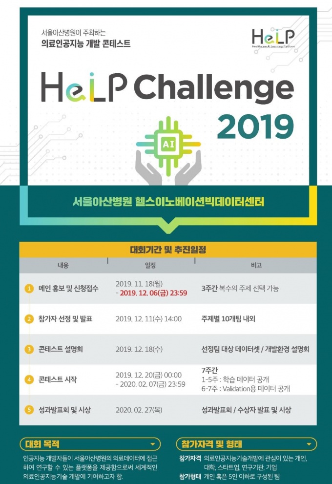 ‘ÀÇ·á ÀΰøÁö´É °³¹ß ÄÜÅ×½ºÆ® 2019(HeLP Challenge 2019)’´Â ¼±Á¤µÈ Âü°¡ÆÀµéÀ» ´ë»óÀ¸·Î ¿ÃÇØ 12¿ù 18ÀÏ¿¡ ¿¸± ÄÜÅ×½ºÆ® ¼³¸íȸ¸¦ ½ÃÀÛÀ¸·Î 20ÀϺÎÅÍ º»°ÝÀûÀÎ ÄÜÅ×½ºÆ®°¡ ½ÃÀ۵г»³â 2¿ù ÃʱîÁö ¾à 2°³¿ù °£ ÁøÇàµÈ´Ù.