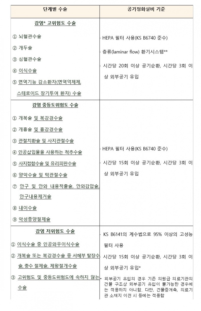 ¶ÇÇÑ Áö³ 2018³â 11¿ù °³Á¤µÈ ¼¼ºÎ±âÁØ¿¡ µû¸£¸é ÀÇ¿ø±Þ ÀÇ·á±â°üÀº °¨¿° °íÀ§Çèµµ ¼ö¼ú(³úÇ÷°ü¼ö¼ú·°³µÎ¼ú·½ÉÇ÷°ü¼ö¼ú·À̽ļö¼ú·¸é¿ª±â´É °¨¼ÒȯÀÚ ¼ö¼ú)À» ½ÃÇàÇÏ´Â °÷ÀÏ °æ¿ì HEPAÇÊÅ͸¦ »ç¿ëÇϸç Ãþ·ù ȯ±â½Ã½ºÅÛÀ» °®Ãß°í ½Ã°£´ç 20ȸ ÀÌ»óÀÇ °ø±â¼øÈ¯ ¹× ½Ã°£´ç 2ȸ ÀÌ»óÀÇ ¿ÜºÎ°ø±â¸¦ À¯ÀÔÇØ¾ß ÇÑ´Ù.