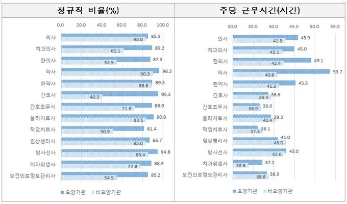 ¿ä¾ç±â°ü ±Ù¹« ÀηÂÀÇ ÁÖ´ç ±Ù¹«½Ã°£Àº ÀÇ»ç 45.9½Ã°£, Ä¡°úÀÇ»ç 45.0½Ã°£, ÇÑÀÇ»ç 49.1½Ã°£, ¾à»ç 53.7½Ã°£, ÇѾà»ç 45.3½Ã°£, °£È£»ç 38.6½Ã°£À¸·Î ³ªÅ¸³µ´Ù.