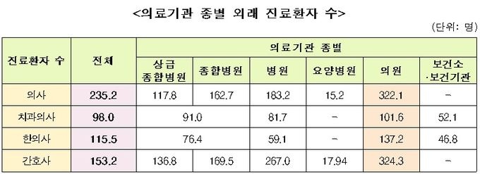 Áø·áȯÀÚÀÇ °æ¿ì ÀÏÁÖÀϰ£ ÀÇ·áÀÎ 1ÀÎ´ç ¿Ü·¡È¯ÀÚ ¼ö´Â ÀÇ»ç 235.2¸í, Ä¡°úÀÇ»ç 98.0¸í, ÇÑÀÇ»ç 115.5¸í, °£È£»ç 153.2¸íÀ̸ç, ÀÇ¿ø±ÞÀÇ ¿Ü·¡È¯ÀÚ ¼ö°¡ ´Ù¸¥ ÀÇ·á±â°üº¸´Ù »ó´ëÀûÀ¸·Î ¸¹¾Ò´Ù.