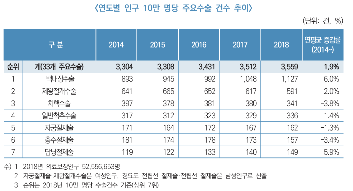 ¼ö¼ú °Ç¼ö·Î º¸¸é, 33°³ ÁÖ¿ä¼ö¼ú Àα¸ 10¸¸ ¸í´Ü ¼ö¼ú°Ç¼ö´Â 2014³â 3304°Ç¿¡¼ 2018³â 3559°ÇÀ¸·Î 5³â µ¿¾È ¿¬Æò±Õ 1.9% Áõ°¡Çß°í, ¹é³»Àå¼ö¼úÀÌ ¿¬°£ 1127°ÇÀ¸·Î °¡Àå ¸¹¾Ò´Ù. Á¦¿ÕÀý°³¼ö¼úÀÌ 591°Ç, Ä¡ÇÙ¼ö¼úÀÌ 341°ÇÀ¸·Î ±× µÚ¸¦ µû¶ú´Ù.