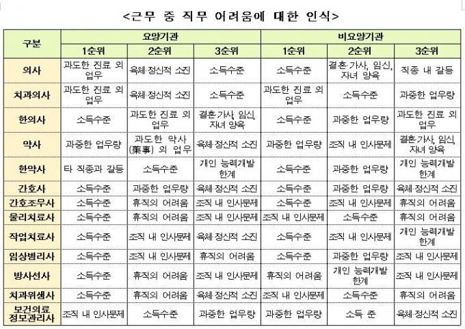°£È£»ç‧°£È£Á¶¹«»ç‧¹°¸®Ä¡·á»ç‧ÀÛ¾÷Ä¡·á»ç‧ÀÓ»óº´¸®»ç‧¹æ»ç¼±»ç‧Ä¡°úÀ§»ý»ç µî¿¡¼ ¼Òµæ¼öÁØÀÌ 1¼øÀ§¿´À¸¸ç ÀÇ»ç¿Í Ä¡°úÀÇ»çµéÀº °úµµÇÑ Áø·á ¿Ü ¾÷¹«, ¾à»ç´Â °úÁßÇÑ ¾÷¹«·®À» °¡Àå Å« ¾î·Á¿òÀ̶ó°í ´äÇß´Ù.