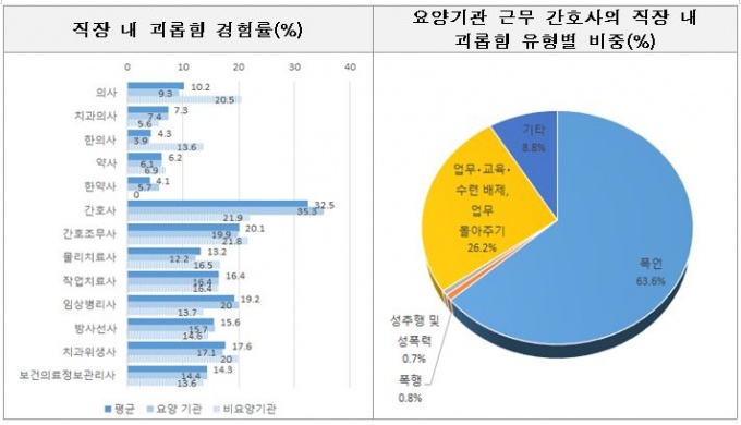 Á÷Àå ³» ±«·ÓÈûÀ» °æÇèÇÑ ºñÀ²Àº °£È£»ç°¡ 32.5%·Î °¡Àå ³ô¾Ò´Âµ¥ ƯÀ¯ÀÇ Å¿ò ¹®È°¡ °á°ú¿¡ ¹Ý¿µµÈ °ÍÀ¸·Î º¸ÀδÙ. °£È£Á¶¹«»ç(20.1%), ÀÓ»óº´¸®»ç(19.2%)°¡ ±× µÚ¸¦ À̾ú°í ÀÇ»ç´Â 10.2%, ÇѾà»ç´Â 4.3%¸¸ Á÷Àå ³» ±«·ÓÈûÀ» °æÇèÇß´Ù.
