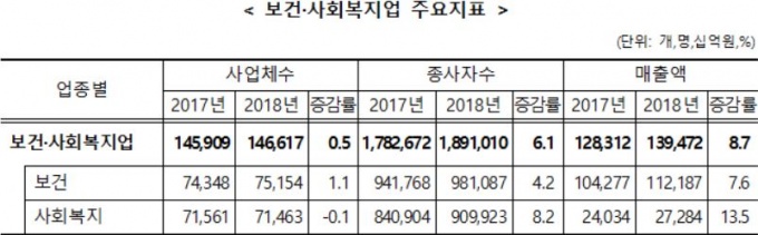 º¸°Ç·»çȸº¹Áö ¾÷ü¿Í Á¾»çÀÚ ¼öµµ °¢°¢ Áõ°¡Çß´Ù. 2017³â º¸°Ç¾÷ü´Â 7¸¸ 4348°³¿¡¼ Áö³ÇØ 7¸¸ 5154°³·Î ´Ã¾ú´Ù. °°Àº ±â°£ 2017³â 14¸¸ 5909°³¿´´ø º¸°Ç·»çȸº¹Áö ¾÷ü´Â Áö³ÇØ 14¸¸ 6617°³·Î 708°÷(0.5%)ÀÌ ´õ »ý°å´Ù.