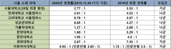 À̳¯ 17½Ã¸¦ ±âÁØÀ¸·Î ¼¿ï ¼ÒÀç ÁÖ¿ä ÀÇ´ë Á¤½Ã ÀϹÝÀüÇü ¸¶°¨ ÇöȲÀ» Á¶»çÇÑ °á°ú, °æÀï·üÀÌ °¡Àå ³ôÀº °÷Àº Áö³ 28ÀÏ ¸ðÁýÀ» ¸¶°¨ÇÑ ¼¿ï´ëÇб³ Àǰú´ëÇÐ(2.77:1)À¸·Î ³ªÅ¸³µ´Ù.