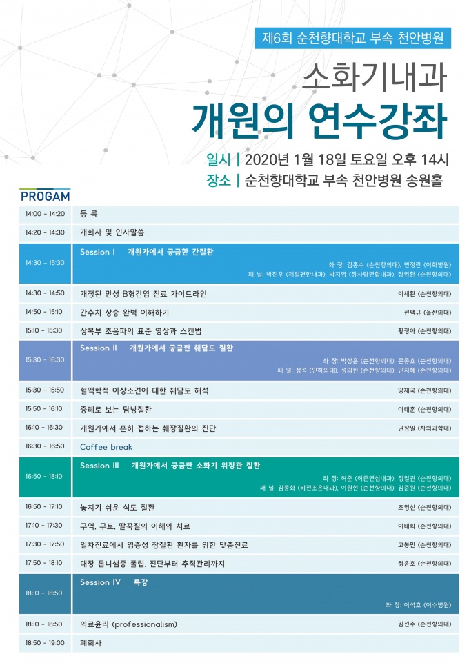 ¼¼ ¹øÂ° ¼¼¼Ç¿¡¼´Â ¼Òȱâ À§Àå°ü ÁúȯÀ» ÁÖÁ¦·Î ¡ã³õÄ¡±â ½¬¿î ½ÄµµÁúȯ(¼øÃµÇâ´ëÀÇ´ë Á¶¿µ½Å ±³¼ö) ¡ã±¸¿ª, ±¸Åä, µþ²ÚÁúÀÇ ÀÌÇØ¿Í Ä¡·á(¼øÃµÇâ´ëÀÇ´ë ÀÌÅÂÈñ ±³¼ö) ¡ãÀÏÂ÷Áø·á¿¡¼ ¿°Áõ¼º ÀåÁúȯ ȯÀÚ¸¦ À§ÇÑ ¸ÂÃã Áø·á(¼øÃµÇâ´ëÀÇ´ë °íºÀ¹Î ±³¼ö) ¡ã´ëÀå Åé´Ï»ùÁ¾ Æú¸³, Áø´ÜºÎÅÍ ÃßÀû°ü¸®±îÁö(¼øÃµÇâ´ëÀÇ´ë Á¤À±È£ ±³¼ö) µîÀÇ ¿¬Á¦°¡ ¸¶·ÃµÆÀ¸¸ç ¸¶Áö¸· ¼¼¼Ç¿¡¼´Â ‘ÀÇ·áÀ±¸®’¸¦ ÁÖÁ¦·Î ¼Òȱ⳻°ú ±è¼±ÁÖ ±³¼öÀÇ Æ¯°ÀÌ ÁøÇàµÈ´Ù.