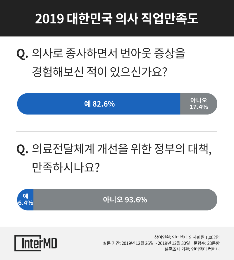 ÀÇ»ç Àü¿ë Áö½Ä·Á¤º¸ °øÀ¯¼ºñ½º ÀÎÅÍ¿¥µð(intermd)°¡ ÃÖ±Ù ¹ßÇ¥ÇÑ ‘2019³â ´ëÇѹα¹ ÀÇ»ç Á÷¾÷¸¸Á·µµ Á¶»ç(2019 Medical Doctor Career Satisfaction Index)’¿¡ µû¸£¸é, ´ëÇѹα¹ ÀÇ»ç 47%°¡ Çö Á÷¾÷¿¡ ‘¸¸Á·ÇÑ´Ù’°í ÀÀ´äÇßÀ¸¸ç, ‘¸Å¿ì ¸¸Á·ÇÑ´Ù’°í ´äÇÑ ÀÇ»ç´Â 20%·Î ³ªÅ¸³µ´Ù.
