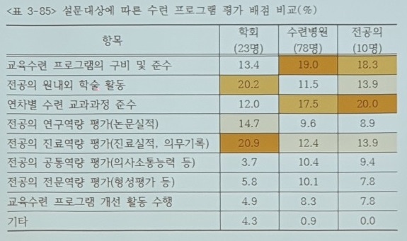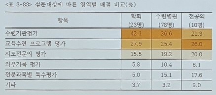 ÇÐȸ¿Í ¼ö·Ãº´¿øÀº ¼ö·Ã±â°ü Æò°¡¸¦, ¹Ý¸é Àü°øÀǵéÀº ¼ö·Ã±³À°ÇÁ·Î±×·¥ Æò°¡¿¡ °¡Àå Å« ºñÁßÀ» µÖ¾ß ÇÑ´Ù´Â ÀÔÀåÀ¸·Î È®ÀεƴÙ.
