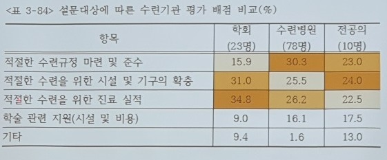 ÇÐȸ(20.9%)´Â Áø·á½ÇÀû, Àǹ«±â·Ï µî Àü°øÀÇ Áø·á¿ª·®À» ²Å¾Ò°í ¼ö·Ãº´¿ø(19%)Àº ±³À°¼ö·Ã ÇÁ·Î±×·¥ ±¸ºñ ¹× Áؼö, Àü°øÀÇ(20%)´Â ¿¬Â÷º° ¼ö·Ã ±³°ú°úÁ¤ Áؼö¸¦ Á¦ÀÏ Áß¿äÇÏ´Ù°í ´äÇß´Ù.