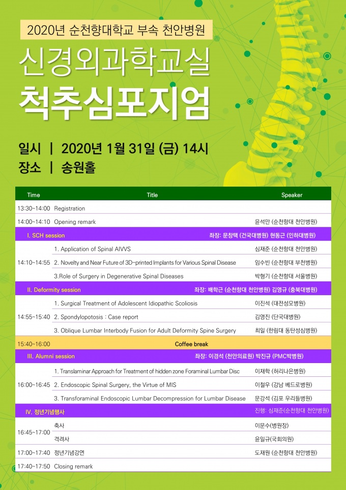 µµÀç¿ø ±³¼öÀÇ Æ¯º°°¿¬ ¿Ü ¿¬Á¦´Â ¡ãApplication of Spinal AIVVS(¼øÃµÇâ´ëõ¾Èº´¿ø ½ÉÀçÁØ ±³¼ö) ¡ãNovelty and Near Future of 3D-printed Implants for Various Spinal Disease(¼øÃµÇâ´ëºÎõº´¿ø ÀÓ¼öºó ±³¼ö) ¡ãRole of Surgery in Degenerative Spinal Diseases(¼øÃµÇâ´ë ¼¿ïº´¿ø ¹ÚÇü±â ±³¼ö) ¡ãSurgical Treatment of Adolescent Idiopathic Scoliosis(°¡Å縯´ë ´ëÀü¼º¸ðº´¿ø ÀÌÁø¼® ±³¼ö) ¡ãSpondylopotosis: Case report(´Ü±¹´ëº´¿ø ±è¿µÁø ±³¼ö) µîÀÌ ¹ßÇ¥µÈ´Ù.
