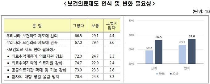 ¿ì¸®³ª¶ó º¸°ÇÀÇ·áÁ¦µµ ´ëÇØ¼´Â ±¹¹ÎÀÇ 66.5%°¡ ½Å·ÚÇϰí, 67.0%°¡ ¸¸Á·ÇÏ´Â °ÍÀ¸·Î ³ªÅ¸³µ´Ù. ÀÇ·áÁ¦µµ¿¡ ´ëÇØ ‘Àß ¾Ë°í ÀÖ´Ù’´Â ÀÀ´äÀÚ´Â 32.6%¿´´Ù.