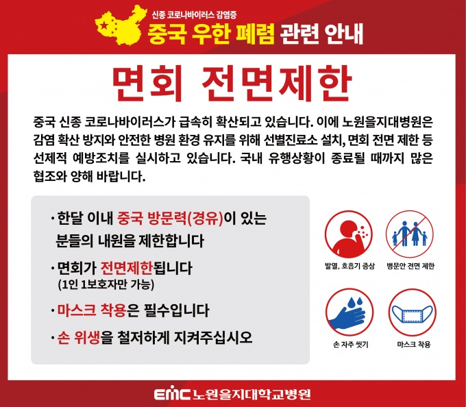 ¶ÇÇÑ °¨¿° ¿¹¹æ È®»ê°ú ȯÀÚ ¾ÈÀüÀ» À§ÇØ ÀÔ¿øÈ¯ÀÚÀÇ ¸éȸ¸¦ ȯÀÚ 1ÀÎ´ç »óÁÖ º¸È£ÀÚ 1¸íÀ¸·Î Á¦ÇÑÇß´Ù. 28ÀϺÎÅÍ ¿Ü·¡ Áø·á½Ã°£¿¡´Â °¢ °Ç¹°º° ÃâÀÔ¹®À» 1°³¸¸ °³¹æÇØ Àüü ³»¿ø°´À» ´ë»óÀ¸·Î Áß±¹ ¹æ¹®(°æÀ¯)·Â È®ÀÎ ¹× ü¿Â ÃøÁ¤ µîÀ» ½Ç½ÃÇϰí ÀÖ´Ù.