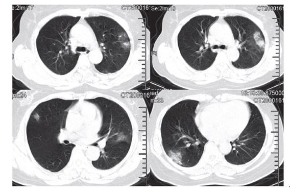 ÁÖ¿ä ÀÓ»ó ¾ç»óÀ¸·Î´Â °í¿, ¸¶¸¥±âħ, ±ÙÀ°Åë, È£Èí°ï¶õ Áõ»óÀÌ ³ªÅ¸³ª¸ç, ÈäºÎ CT ÃÔ¿µ°á°ú Æó·Å ¼Ò°ßÀÌ ³ª¿Ô´Ù°í ¼Ò°³Çß´Ù. (Bilateral GGO, subsegmental consolidation)