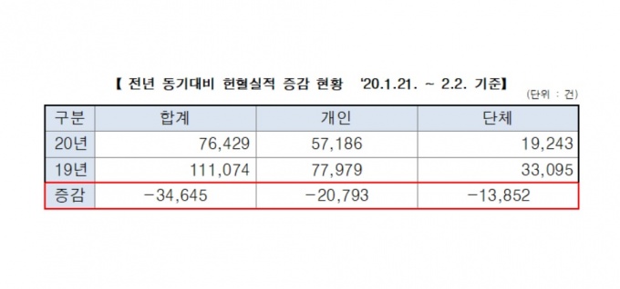 ´ëÇÑÀû½ÊÀڻ翡 µû¸£¸é ±¹³» ½ÅÁ¾ Äڷγª¹ÙÀÌ·¯½º È®ÁøÀÚ°¡ ¹ß»ýÇÑ 1¿ù 21ÀϺÎÅÍ 2¿ù 2ÀÏÀ» ±âÁØÀ¸·Î À۳⠴ëºñ 3¸¸4645°ÇÀÌ °¨¼ÒÇßÀ¸¸ç, °³ÀÎ ÇåÇ÷½ÇÀûÀÌ µ¿±â°£ ´ëºñ 2¸¸793°Ç, ´ÜüÇåÇ÷ÀÌ 1¸¸3852°Ç °¨¼ÒÇß´Ù.