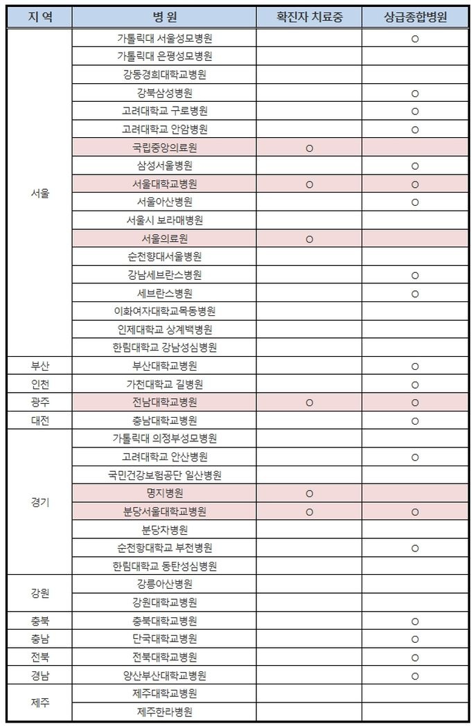 ƯÈ÷ ¼¿ï´ëº´¿ø, ¼¿ïÀÇ·á¿ø, ±¹¸³Áß¾ÓÀÇ·á¿ø, ºÐ´ç¼¿ï´ëº´¿ø, ¸íÁöº´¿ø, Àü³²´ëº´¿ø µî 6°÷Àº ÇöÀç ½ÅÁ¾ Äڷγª¹ÙÀÌ·¯½º °¨¿°Áõ È®ÁøÀÚ°¡ ÀÔ¿ø Ä¡·á ÁßÀÌ´Ù.