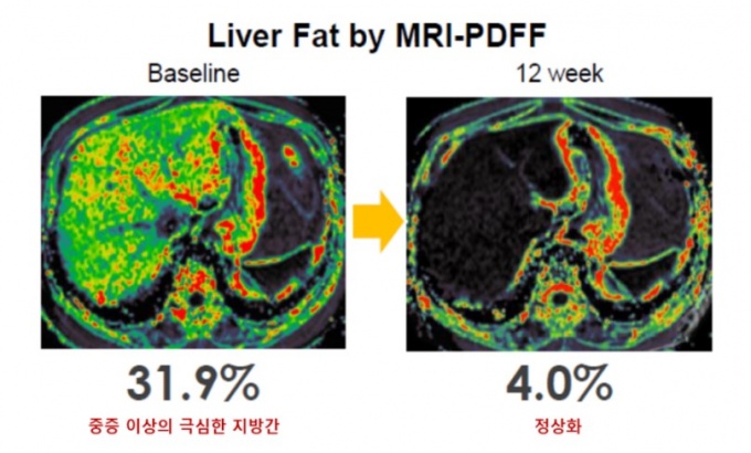 ¸ÕÀú Çѹ̾àǰÀº MRI-PDFF(ÀÚ±â°ø¸í¿µ»ó-¾çÀڹеµ Áö¹æºñÀ²) °Ë»ç¿¡¼ ÀǹÌÀÖ´Â Áö¹æ °¨¼Ò È¿°ú¸¦ ºñ¸¸ÀÌ µ¿¹ÝµÈ NAFLD ȯÀÚ¿¡¼ È®ÀÎÇß´Ù.